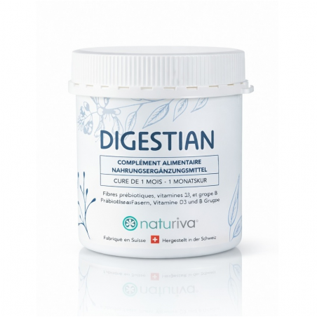 DIGESTIAN est un complément alimentaire à base de fibres prébiotiques et de vitamines, conçu pour favoriser un transit harmonieux et contribuer au confort digestif.